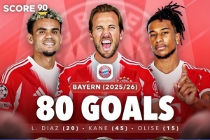 体育资讯3月11日讯 本赛季欧洲五大联赛的攻击线,风头最盛的莫过于拜仁凯恩、迪亚斯、奥利塞组成的三叉戟组合。据score90数据统计,拜仁三叉戟截止目前已经打进80球,距离当年在欧洲所向披靡的巴萨MSN组合最高单赛季纪录131球,还差51球。