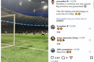 穆勒社媒晒出点射破门的视频,配文:“补时的点球总是格外特别,现场情绪肯定爆棚。