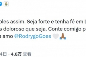 体育资讯3月4日讯 皇马官方确认,队内前锋罗德里戈右膝十字韧带断裂,外侧半月板断裂,队友米利唐社媒留言鼓励罗德里戈。